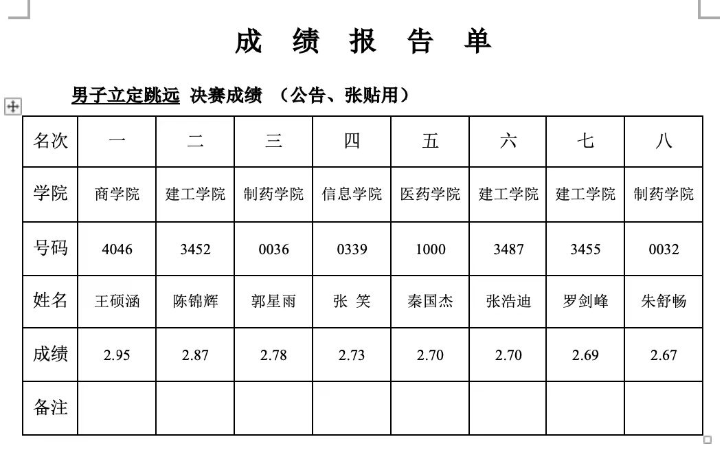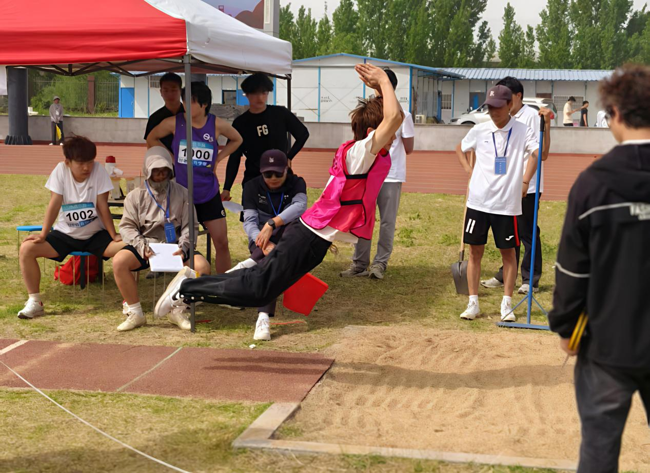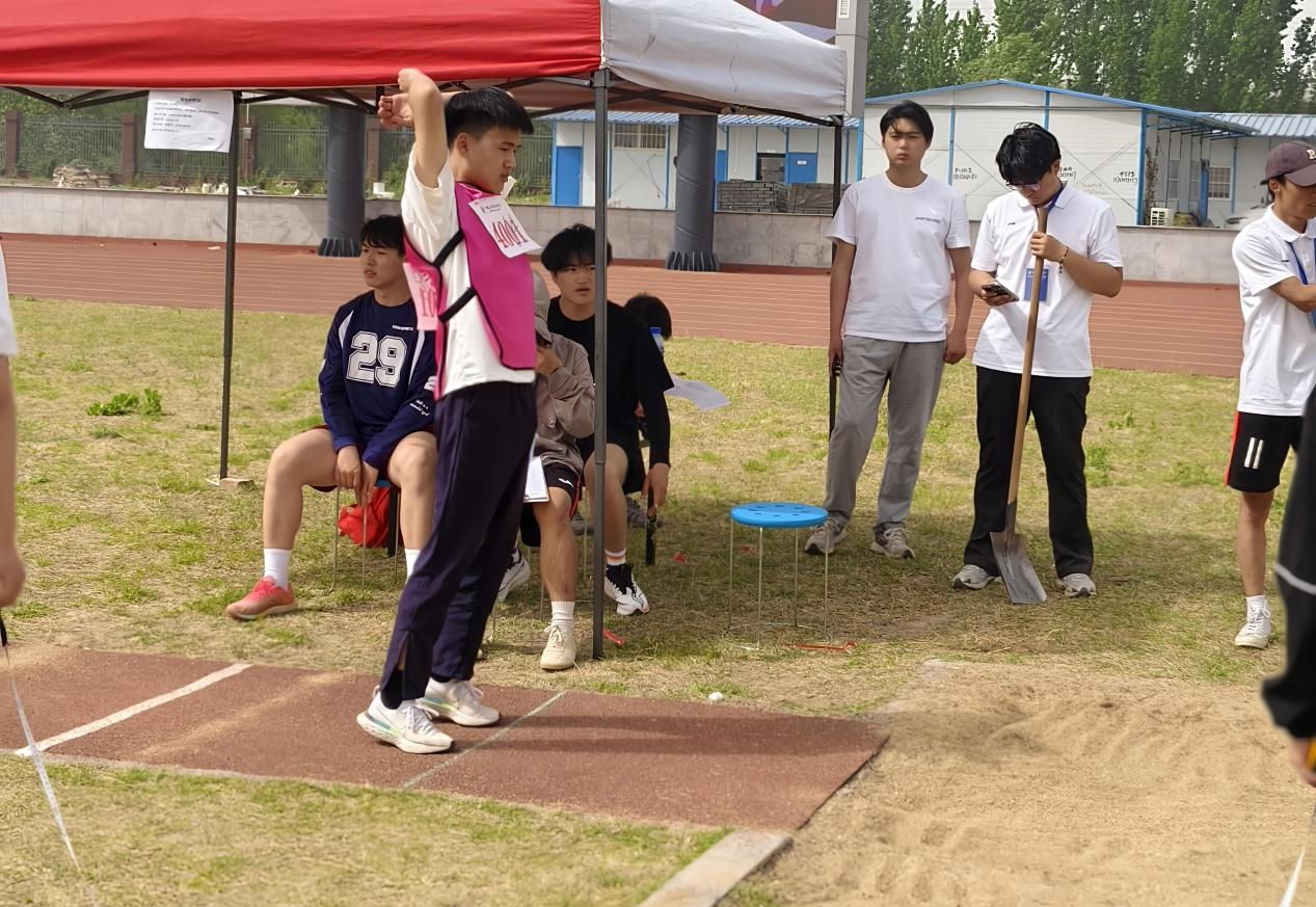 男子立定跳远赛场,选手们屏气聚力,纵身一跃,在空中留下完美弧度。观众加油声此起彼伏,最终网营2302班王硕涵取得了第一的好成绩。