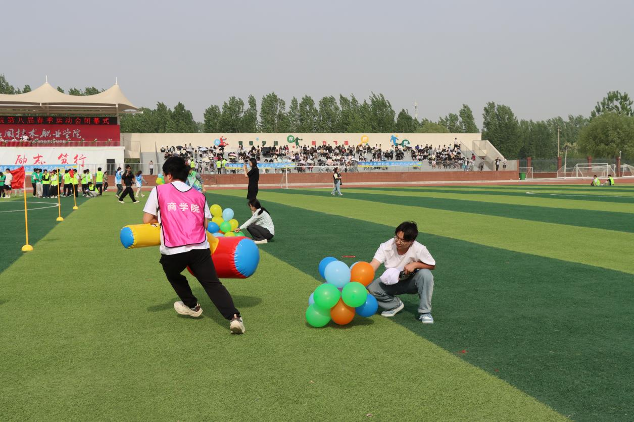 教职工趣味比赛成为赛场别样的风景线。比赛项目丰富,包含毛毛虫、运球上篮和集体跳大绳。毛毛虫比赛中,教职工分组骑在“毛毛虫”道具上,喊着口号奋力前冲,赛场氛围热烈;运球上篮时,老师们运球跑并投篮,有人动作娴熟,有人虽显慌乱却坚持完成比赛;跳大绳时,两位老师摇绳,其余老师依次跳绳,节奏把握良好,整个趣味赛充分展现了教职工积极向上的精神风貌。