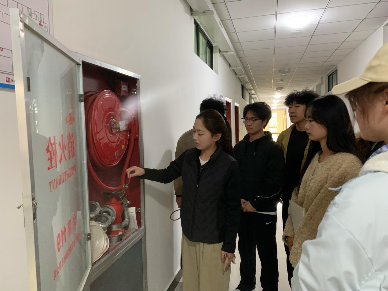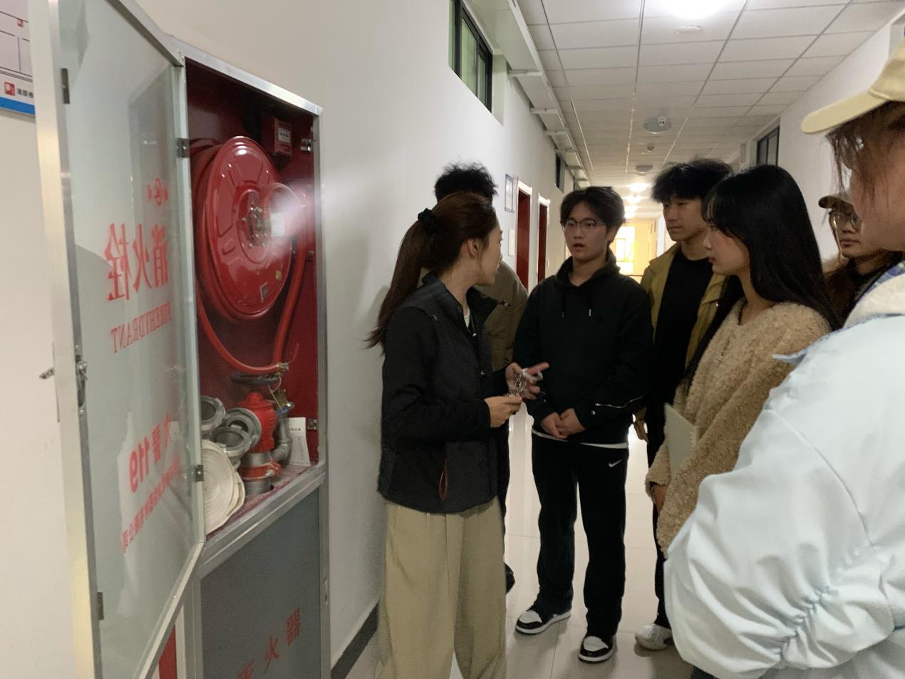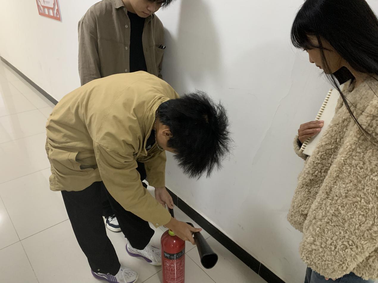 活动现场,同学们先后走进物流仿真实训室、直播间、电子商务沙盘实训室等教学场地,围绕不同场地的消防风险点、特殊消防注意事项,以及灭火器、消火栓等器材的基础使用知识展开学习,深刻领会“预防先行”“小火会灭”“大火会逃”的消防核心要义;随后在实训室管理员带领下,大家实地查看beat365英国官方网站实训教室各楼层及楼梯间灭火装备,管理员同步详细讲解墙壁消火栓、应急灭火箱的功能作用及消防水带的存放位置与取用规范,并组织学生分组开展灭火器实操练习——从提握灭火器的正确姿势、保险销的拔除方法,到对准火源根部按压喷射的操作要点,管理员全程逐项示范、反复强调规范,引导学生树立消防实战意识,确保每位同学都能熟练掌握操作技巧,切实将“小火会灭”的技能落到实处。