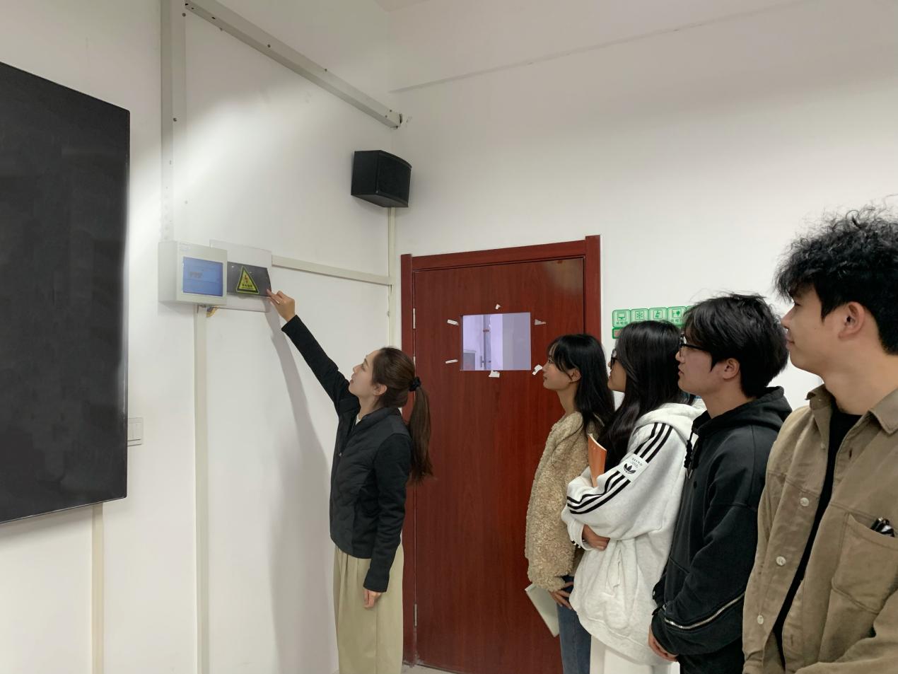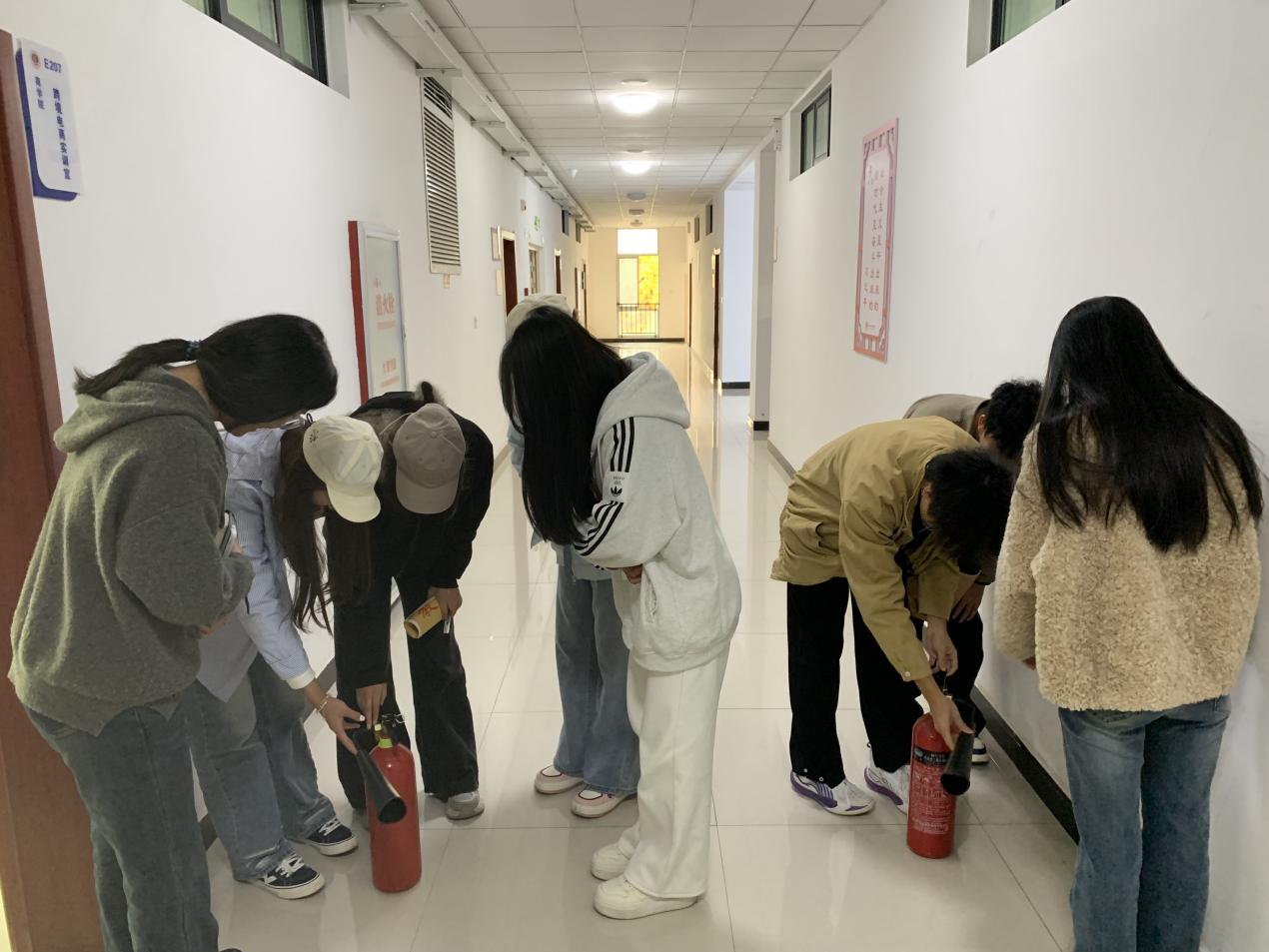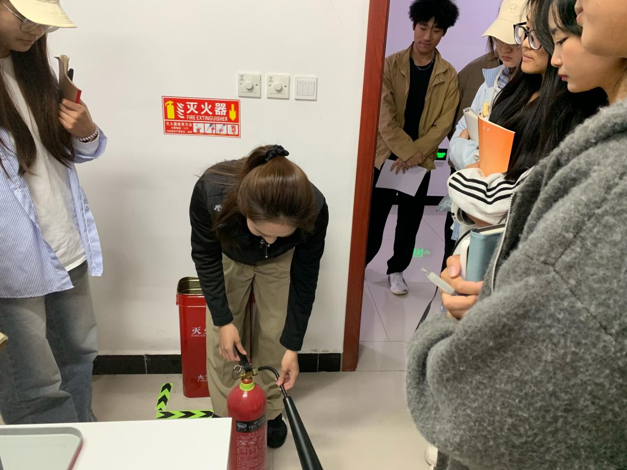 活动现场,同学们先后走进物流仿真实训室、直播间、电子商务沙盘实训室等教学场地,围绕不同场地的消防风险点、特殊消防注意事项,以及灭火器、消火栓等器材的基础使用知识展开学习,深刻领会“预防先行”“小火会灭”“大火会逃”的消防核心要义;随后在实训室管理员带领下,大家实地查看beat365英国官方网站实训教室各楼层及楼梯间灭火装备,管理员同步详细讲解墙壁消火栓、应急灭火箱的功能作用及消防水带的存放位置与取用规范,并组织学生分组开展灭火器实操练习——从提握灭火器的正确姿势、保险销的拔除方法,到对准火源根部按压喷射的操作要点,管理员全程逐项示范、反复强调规范,引导学生树立消防实战意识,确保每位同学都能熟练掌握操作技巧,切实将“小火会灭”的技能落到实处。
