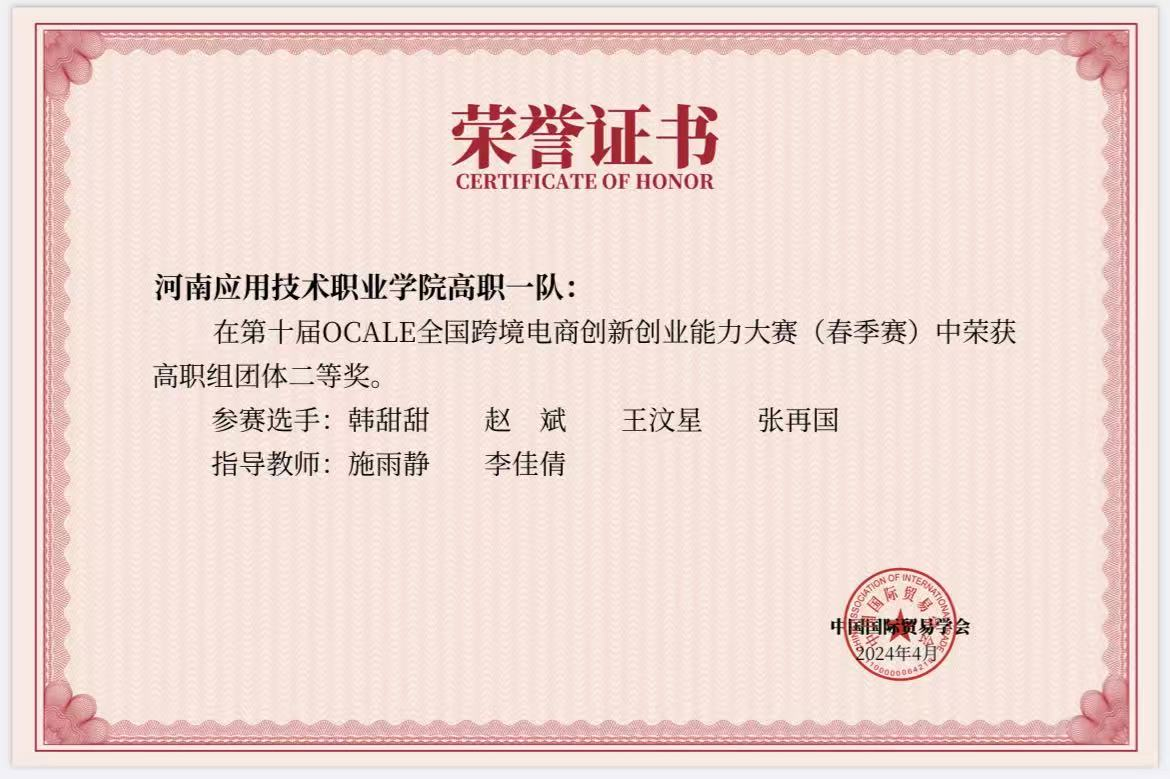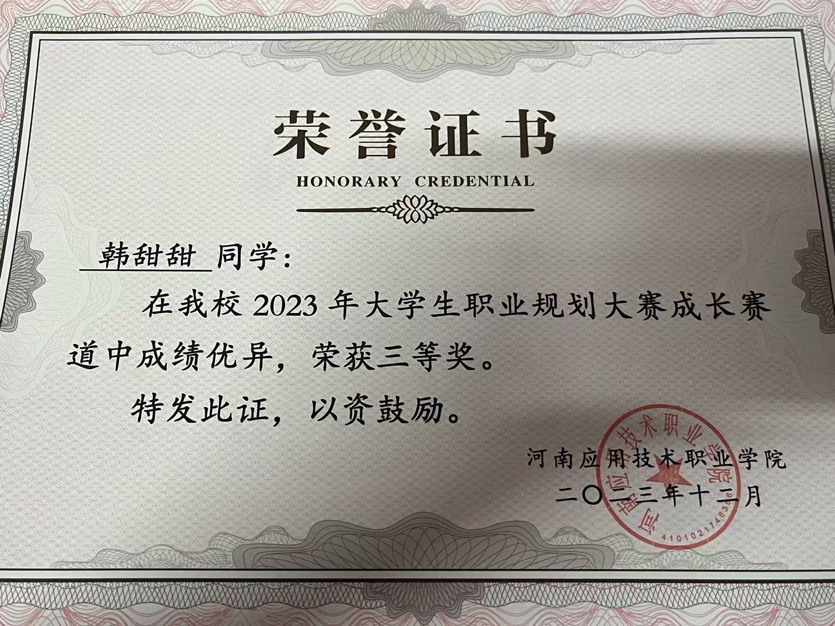 在学习中,韩甜甜坚持 “课前预习、课中深耕、课后答疑” 的严谨态度,带着疑问听课、重点难点必究,以闭环学习法夯实专业基础。她始终相信 “以赛促学” 的成长路径,主动投身各级各类技能竞赛,将课堂知识转化为实践能力。在全国跨境电商创新创业能力大赛中,她深耕方案设计与模拟运营,斩获团体与个人二等奖;在河南省跨境电子商务赛项中,凭借精准解题思路与优化操作流程,勇夺一等奖;还先后拿下河南省大学生创新大赛三等奖及多项校级竞赛荣誉,形成 “学习 - 实践 - 改进” 的良性循环。如今,她的班级与专业成绩、量化排名均稳定第一,用实力印证了勤学善思的优良学风。