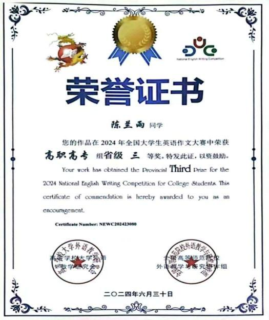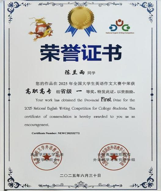 陈兰雨以坚定的理想信念为指引,以自主学习为引擎,以跨学科探索为路径,在不断的自我挑战与多元实践中实现了综合素质的显著提升。她的成长历程深刻表明,勇于突破专业局限、善于整合多元知识、勤于投身实践锻炼,是当代高职学生脱颖而出的重要路径。获得国家奖学金既是对她过往努力的充分肯定,更是对其未来发展的更高期许。陈兰雨将继续秉持自信自律、跨界学习、勇于实践的态度,在更广阔的人生舞台上持续探索、书写青春华章。