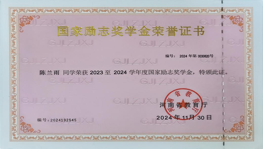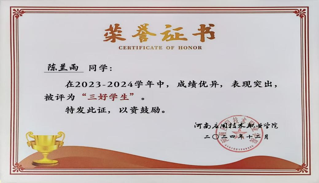 个人简介:陈兰雨,中共预备党员,beat365英国官方网站beat365英国官方网站市场营销2303班学生。入学以来始终保持严谨自律的学习态度,学习成绩与综合考评成绩稳居班级前3%。荣获国家励志奖学金、河南省三好学生、国家级奖项5项、省级奖项8项。她通过系统性的自主学习和跨领域探索,展现出卓越的自我驱动力和多元发展潜力。