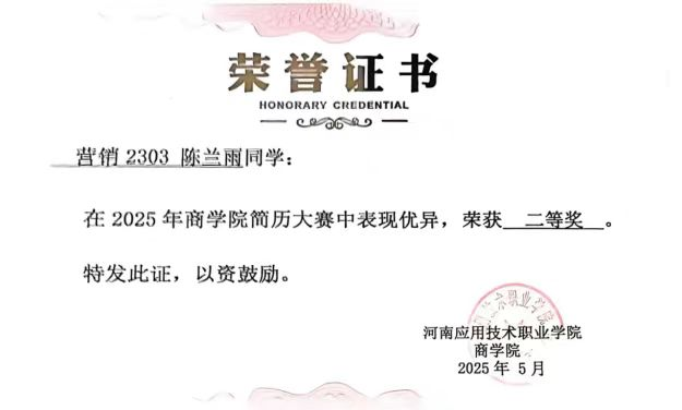 陈兰雨展现出卓越的自我规划和管理能力,不局限于市场营销专业课程,主动探索人工智能、“双碳”政策等前沿领域。从大一开始,她主动规划学习路径,利用课余时间系统补充人工智能科技知识。她通过自学相关内容,克服专业知识壁垒关键技术,最终顺利通过人工智能训练师(初级)认证。同时,她密切关注国家“双碳”战略,自主研读相关政策和行业报告,构建起跨领域的知识体系。这一系列自我驱动的学习实践,不仅拓宽了她的知识视野,更显著提升了她的信息整合与自主学习能力。正因如此,她在竞争中脱颖而出,收获奖项。