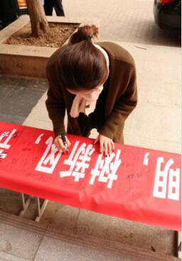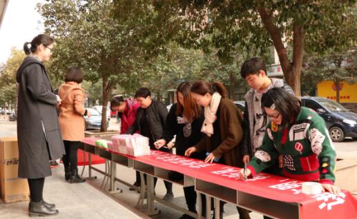 阳春三月,绿柳成荫,郑州威尼斯城开社区服务中心门前热闹非凡,无论过往的买菜的大妈,遛弯的老人,接孩子的父母,还是刚刚放学的学生,都驻足在巨大的条幅前,听着我校党员志愿者讲解垃圾的危害、家庭生活垃圾分类的小方法。在“讲文明,树新风,节约环保在心中,动动手、分分类,绿水青山齐保卫”的条幅上,热心的居民纷纷留下自己的签名,有的还打电话叫来附近的家人,一起为共同的生活环境做一点贡献。瞧,他们签名是多么的认真!