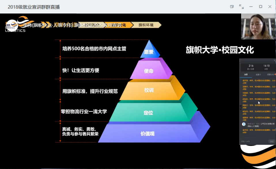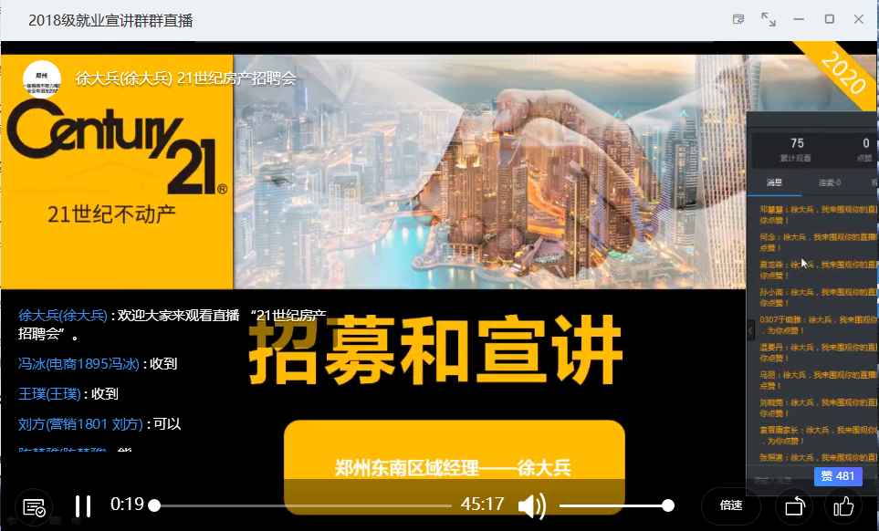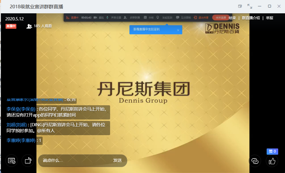 自线上云招聘开启以来,同学们反响热烈,积极参与。beat365英国官方网站多措并举,持续发力,于2020年5月12日下午举行了3场联播云招聘活动。本次招聘由丹尼斯总部人力开发处经理欧阳贞妮、河南旗帜物流有限公司人事经理李伟和21世纪郑州东南片区经理徐大兵为2018级学生做就业宣讲,beat365英国官方网站2018级400余名学生通过钉钉直播参与宣讲会。