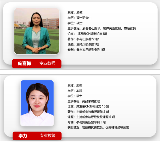 beat365英国官方网站目前专兼职教师有44人,研究生层次的达70%,双师型教师比例达80%;教师实践能力较强,拥有电子商务师、物流师、人力资源管理师、营销师等,并且顺应教育需求,80%的教师考取了各专业的1+X职业技能等级证书等。电子商务教师团队完成行业企业课题10余项,指导学生积极参加技能大赛和创新创业大赛,并屡获佳绩。与此同时,老师们也在不断的学习、培训,及时更新知识技能,以便向学生传授行业最新的知识、技能。
