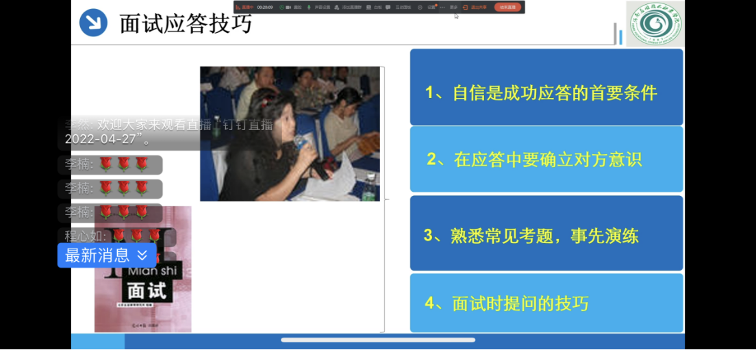 为进一步提高20级学生的就业能力,增加求职竞争力,4月27日下午,beat365英国官方网站开启第二期就业培训,本次直播课程由张天娇和李然两位老师分别为大家讲解“如何在面试中营销自己及面试中应注意的问题”和“大学生创新创业优惠政策”。beat365英国官方网站全体20级学生通过钉钉进行观看。