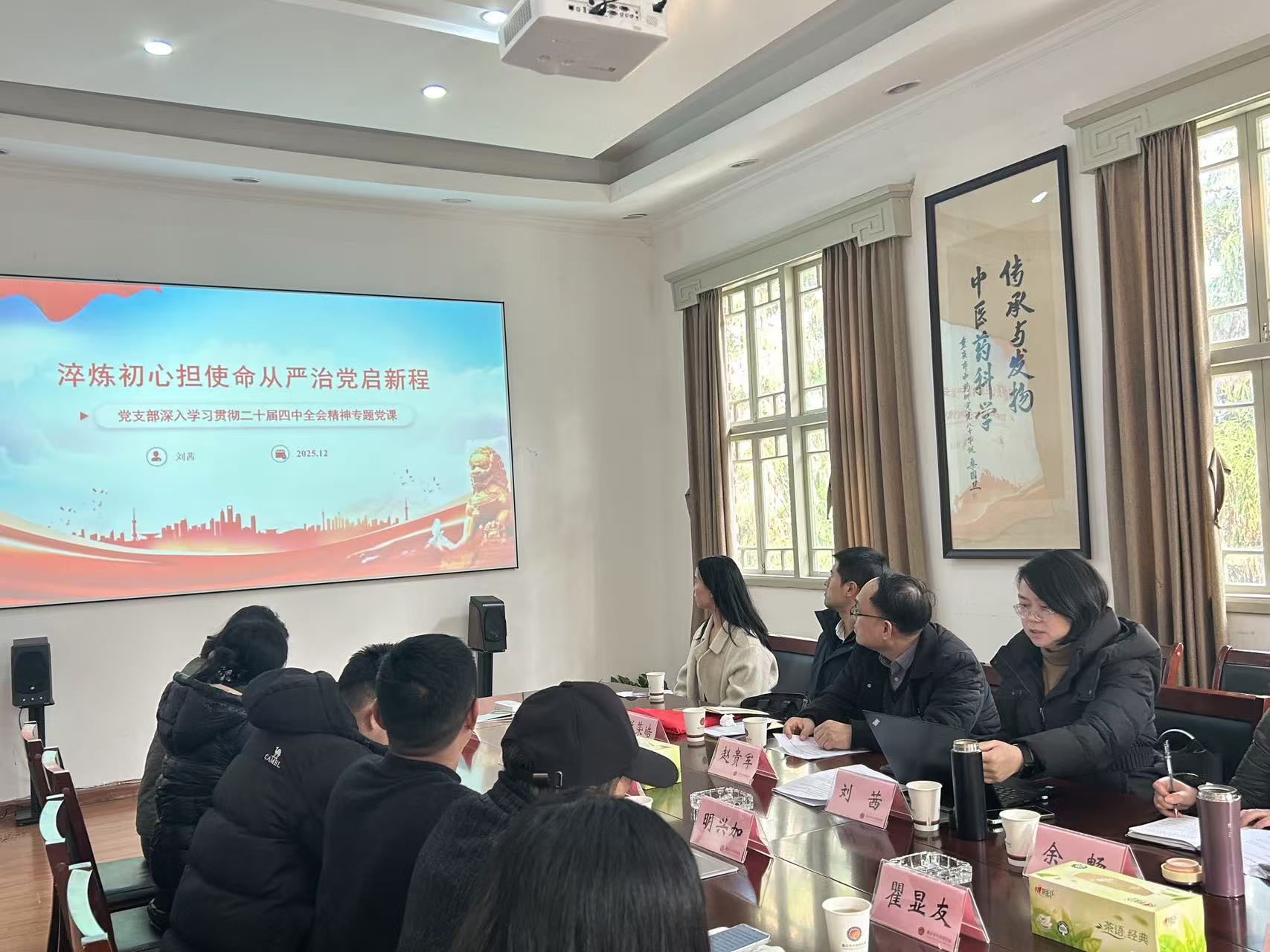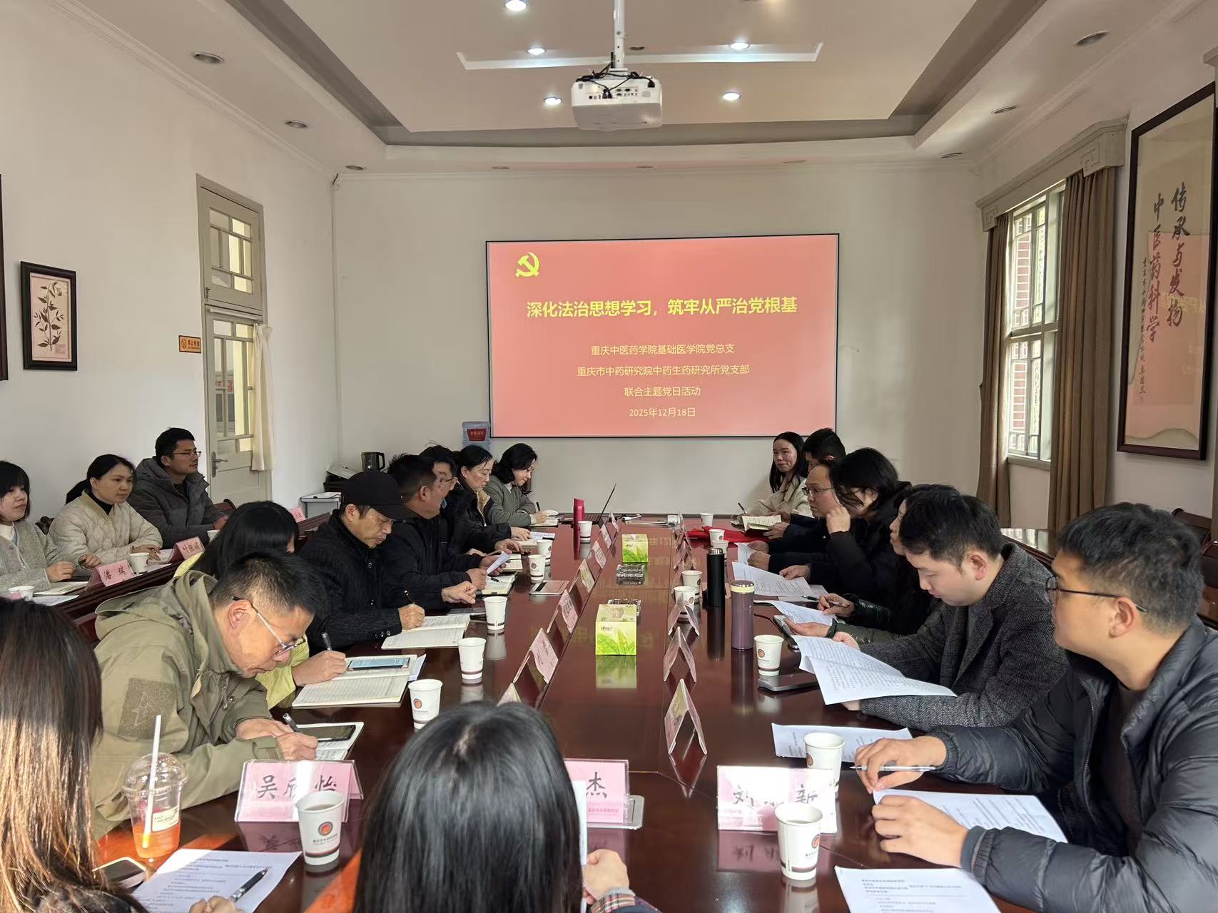 为深入学习贯彻习近平新时代中国特色社会主义思想,强化法治思维,筑牢从严治党根基,推动党建与业务深度融合,2025年12月18日,bat365中文官方网站基础医学院党总支与重庆市中药研究院中药生药研究所党支部在重庆市中药研究院开展了 “深化法治思想学习,筑牢从严治党根基” 联合主题党日活动。全体党员及部分非党员代表齐聚一堂,以“理论学习+党课宣讲+座谈交流+实地研学”的形式,共话党建引领事业发展新探索。