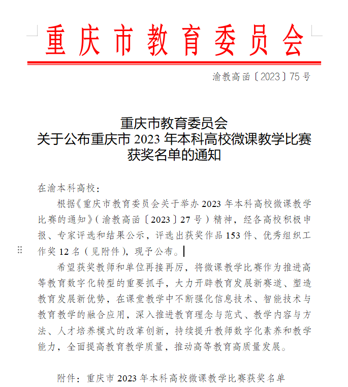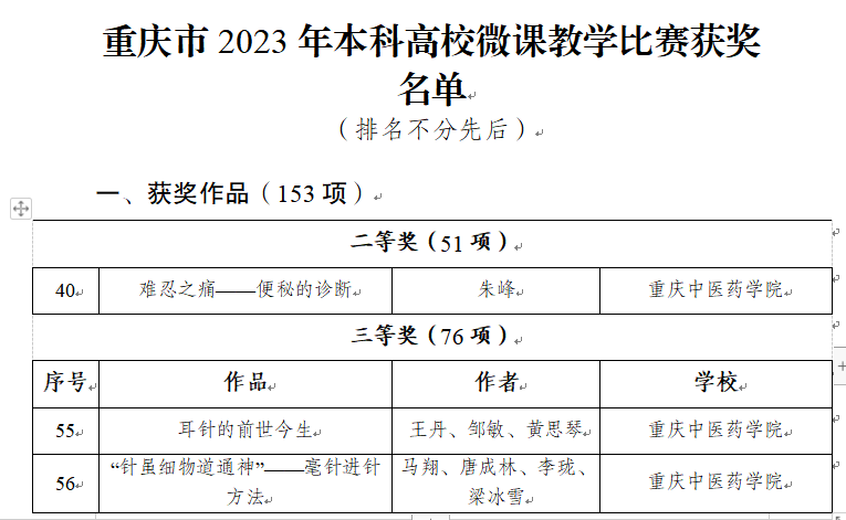 近日,重庆市教育委员会公布了《重庆市教育委员会关于公布重庆市2023年本科高校微课教学比赛获奖名单的通知》(渝教高函〔2023〕75号),bat365参赛作品《忍之痛——便秘的诊断难》荣获微课教学比赛二等奖,《耳针的前世今生》《“针虽细物道通神”——毫针进针方法》2项作品荣获微课教学比赛三等奖。