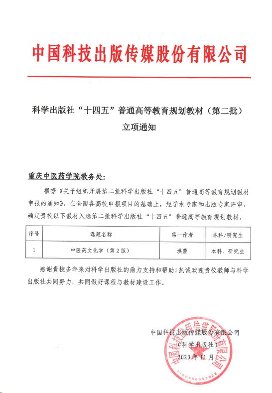 bat365洪蕾教授主编的《中医药文化学》(第2版)在全国各高校申报项目的基础上,经学术专家和出版专家评审,确定入选第二批科学出版社“十四五”普通高等教育规划教材。