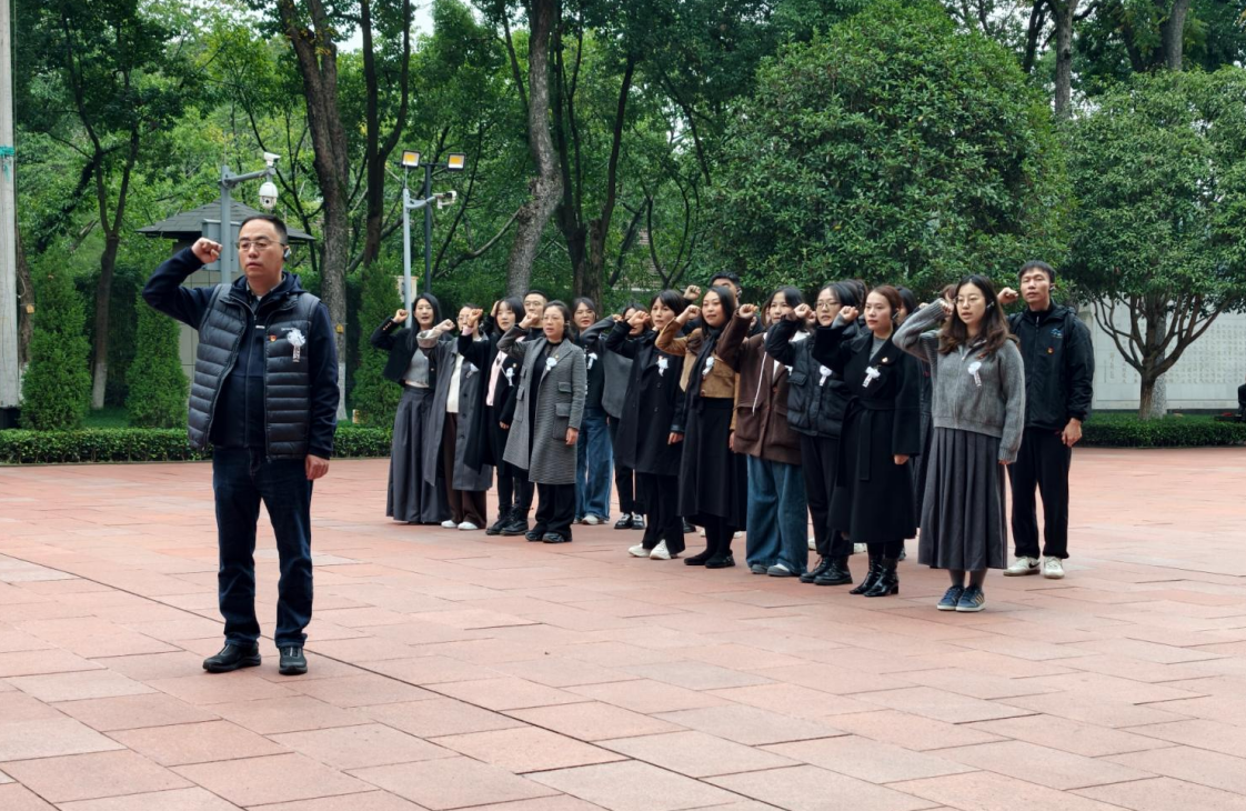 在庄严肃穆的烈士墓前,党支部举行了隆重的祭奠仪式。唐樵书记与全体党员整齐列队,共同向革命烈士敬献鲜花,深深鞠躬,以此表达对先烈的深切缅怀与崇高敬意。面对鲜红的中国共产党党旗,唐樵书记领誓,与全体党员一同举起右拳,重温入党誓词。“我志愿加入中国共产党,拥护党的纲领,遵守党的章程……”铿锵有力的誓言回荡在烈士墓旁,也镌刻在每一位党员的心中,进一步坚定了大家为党的教育事业奋斗终身的决心。