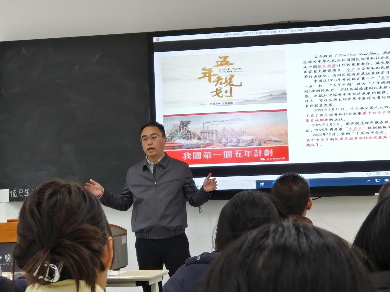 唐书记以“五年规划”为切入点,通过鲜活案例与数据对比,生动阐释我国制度优势的实践伟力,引导学生深刻理解“中国之治”背后的制度密码。再从“风雨兼程见彩虹”“富经验释伟力”“凌云纵横绘蓝图”三个方面深入阐释了“十四五”取得成就、“六个坚持”重要原则和“十五五”规划蓝图。