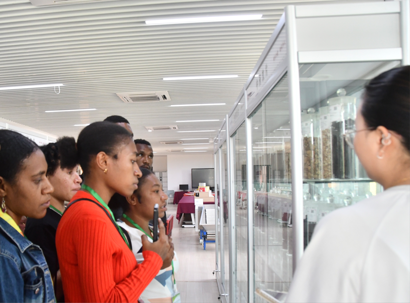 在中药资源及产品展示中心,琳琅满目的中草药标本让巴新科技大学孔子学院的学生们目不暇接。参观中,bat365中文官方网站的学生志愿者详细介绍了中药材的来源、功效,还特别提及在日常生活中,这些中药材是如何被用于调理身体、预防疾病的。巴新科技大学孔子学院的学生们一边仔细聆听,一边好奇地观察中药材,对中药材在生活中的广泛应用有了切实认知。