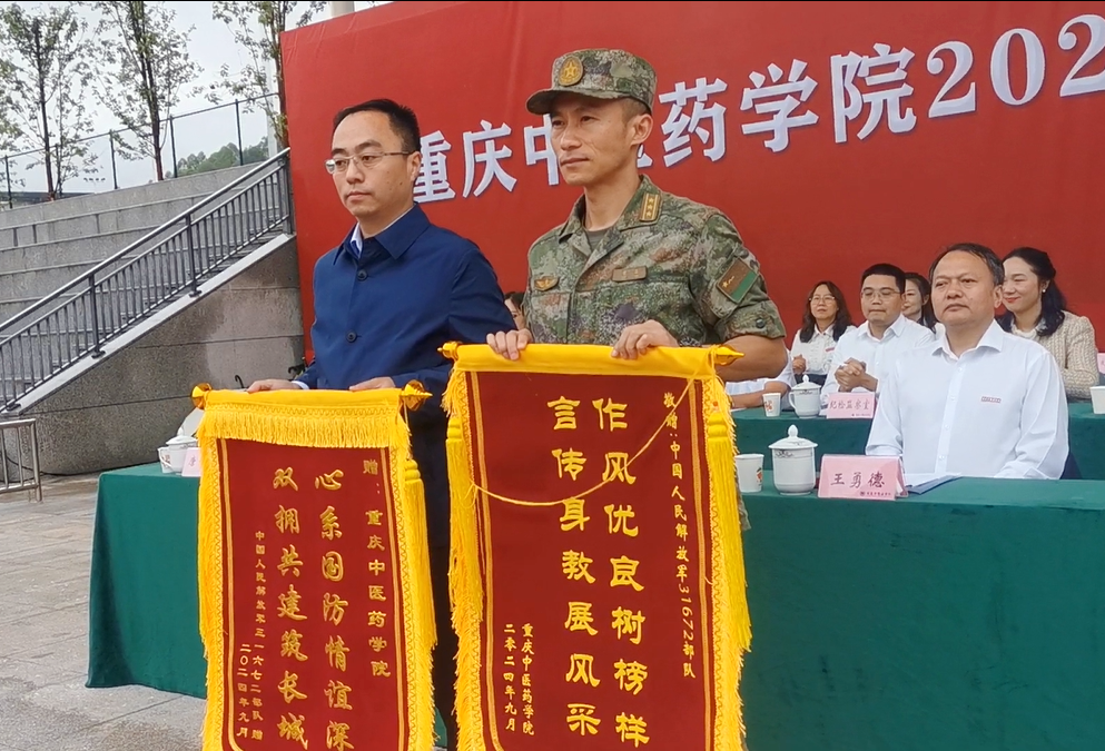 ▲党委常委、纪委书记唐樵代表学院与承训部队互赠锦旗