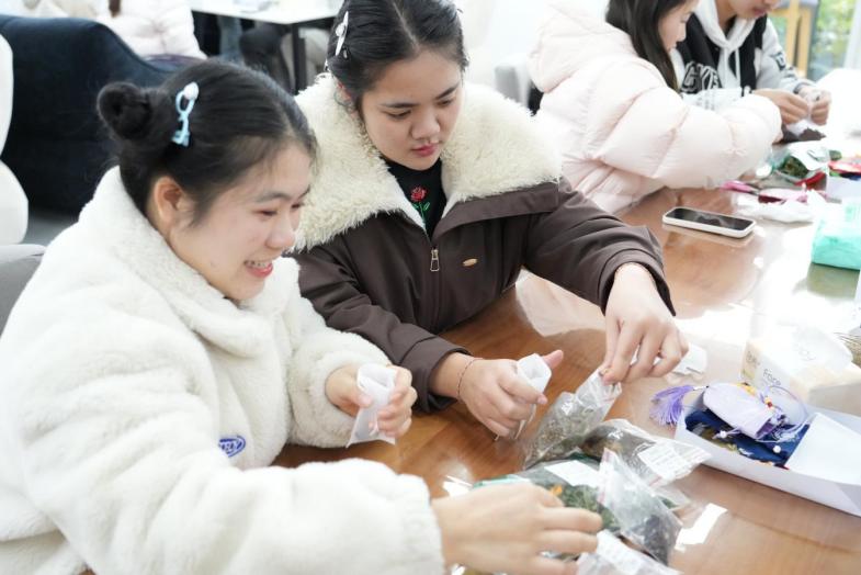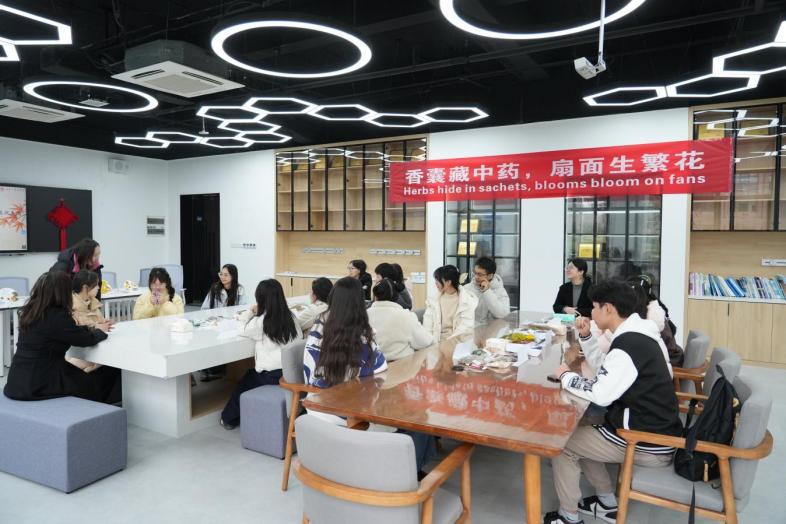 研学期间,留学生代表团积极参与香囊、中药团扇制作等中医药文化特色活动,参观了bat365通识学院健康服务与管理专业实训室,并在指导老师的带领下,亲身体验了中医传统养生功法五禽戏。